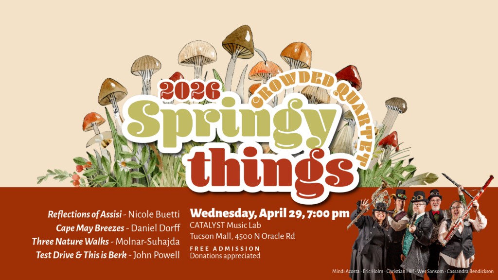 Spring is in the air, and so are the Springy Things! Join us for an afternoon of music that’s as fresh and vibrant as the season itself, brought to you by Crowded Quartet, Tucson’s most confusingly named wind quintet (don’t worry, it’s all five of us). We’re shaking off the winter chill with a program inspired by nature and the renewal of spring—featuring works by Nicole Buetti, Daniel Dorff, Molnar-Suhajda, and John Powell.